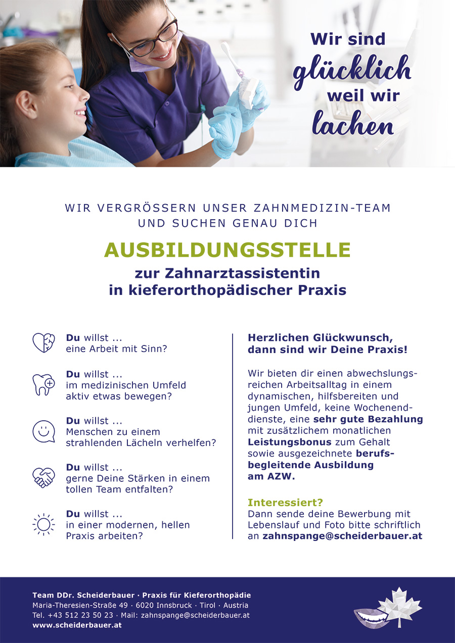 Dann bewirb dich jetzt in unserer kieferorthopädischen Praxis in Innsbruck für die Ausbildungsstelle. Maile deine Bewerbungsunterlagen gleich an: