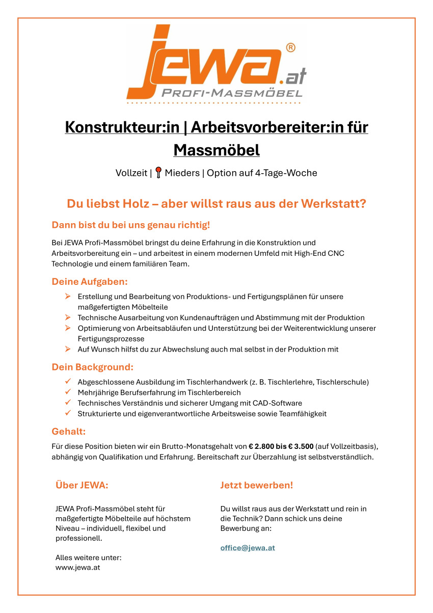 Bei JEWA Profi-Massmöbel bringst du deine Erfahrung in die Konstruktion und Arbeitsvorbereitung ein – und arbeitest in einem modernen Umfeld mit High-End CNC Technologie und einem familiären Team.