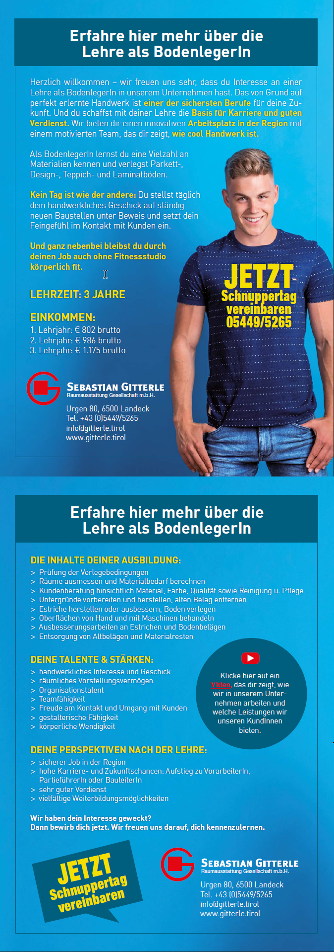 Herzlich willkommen – wir freuen uns sehr, dass du Interesse an einer Lehre als BodenlegerIn in unserem Unternehmen hast. Das von Grund auf perfekt erlernte Handwerk ist einer der sichersten Berufe für deine Zukunft. Und du schaffst mit deiner Lehre die Basis für Karriere und guten Verdienst. Wir bieten dir einen innovativen Arbeitsplatz in der Region mit einem motivierten Team, das dir zeigt, wie cool Handwerk ist.