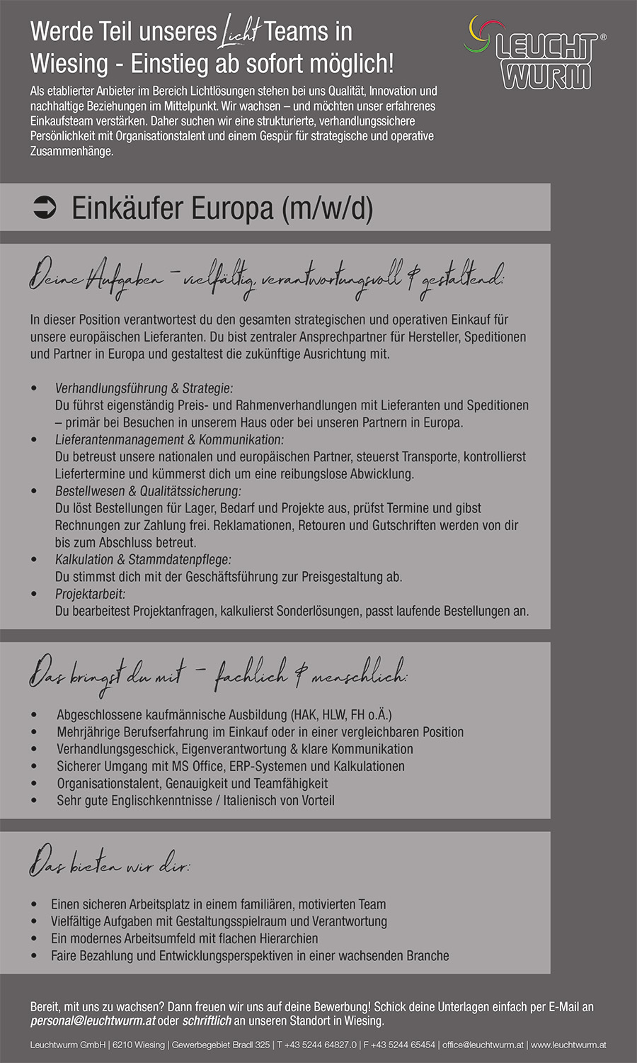 Bereit, mit uns zu wachsen? Dann freuen wir uns auf deine Bewerbung! Schick deine Unterlagen einfach per E-Mail an personal@leuchtwurm.at oder schriftlich an unseren Standort in Wiesing.